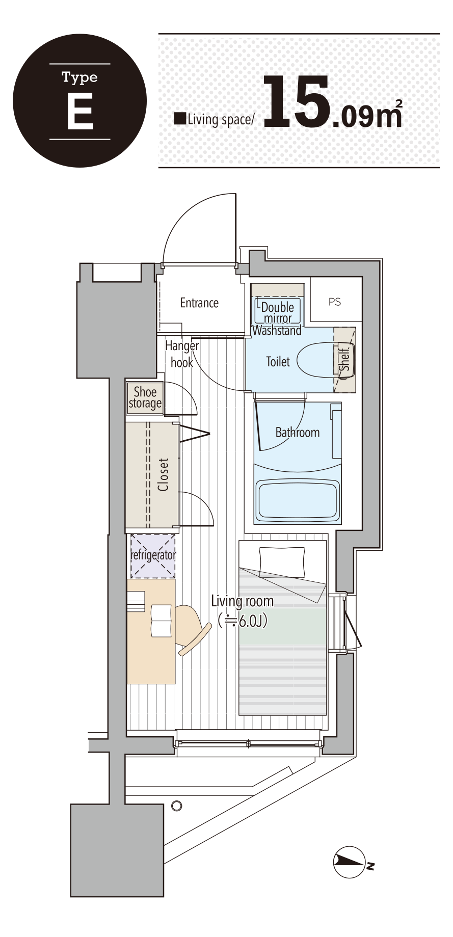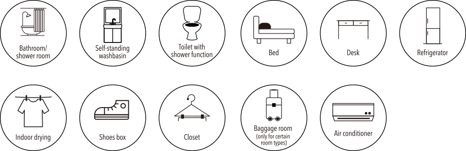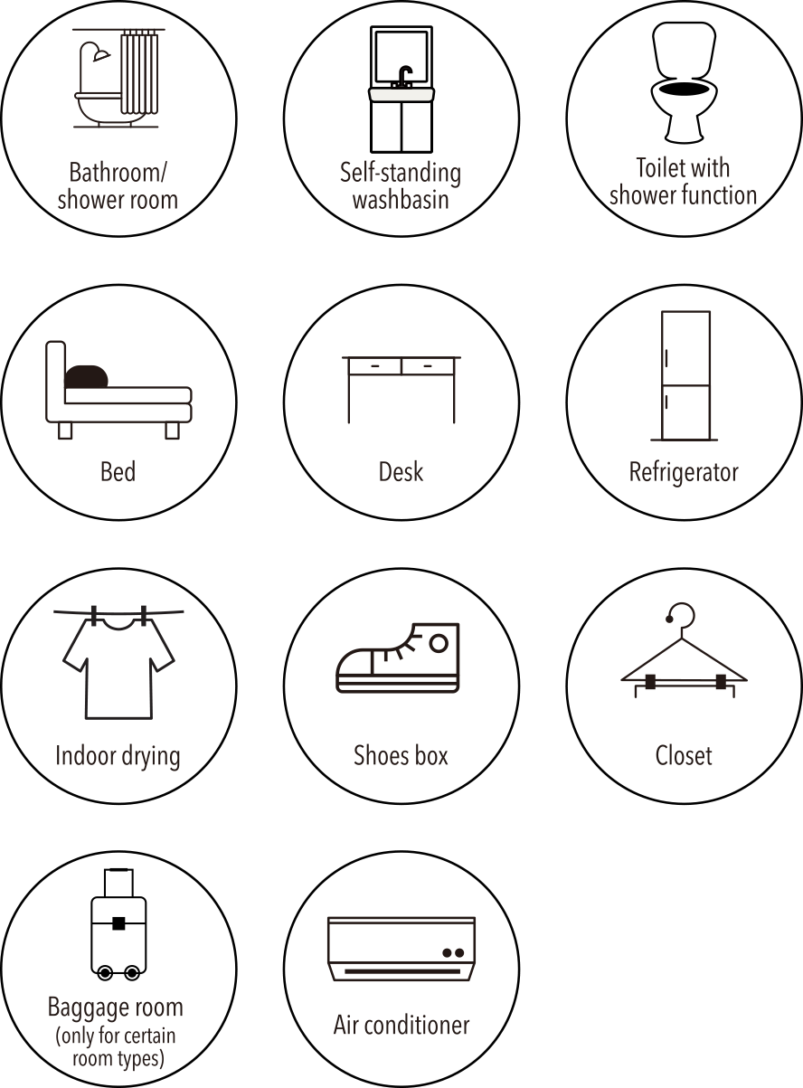 bed(bottom drawers)/desk/chair/AC/ceiling light/rack for drying clothes/trunk room(depending on room type)