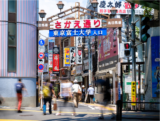 ガード下そばから東京富士大学の前まで、約200mの通りに新旧様々なお店が並ぶ。昭和の雰囲気が学生の街にぴったり。
