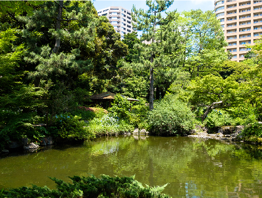 区立唯一の回遊式庭園。元々は尾張徳川家の拝領地だった。春の桜、秋の紅葉、冬の雪吊りなど、四季を通して美しい。