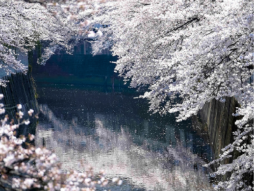 川沿いは桜並木が続き、遊歩道も整備されている神田川。照明が灯る夜もロマンチックな、歩いてすぐの花見スポット。