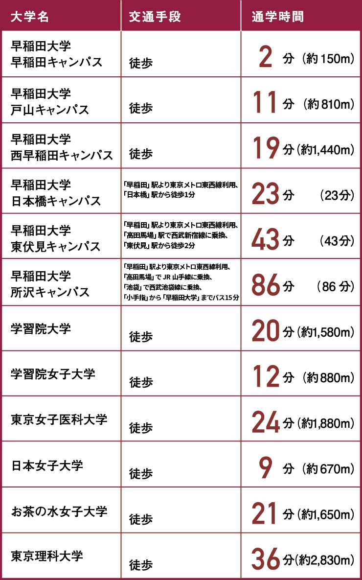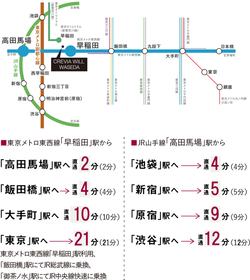 ※上記所要時間は、 通勤時 (7:30~9:00到着) の最短時間を表したもので、 時間帯により異なります。 また乗換え、 待ち時間を含みます。